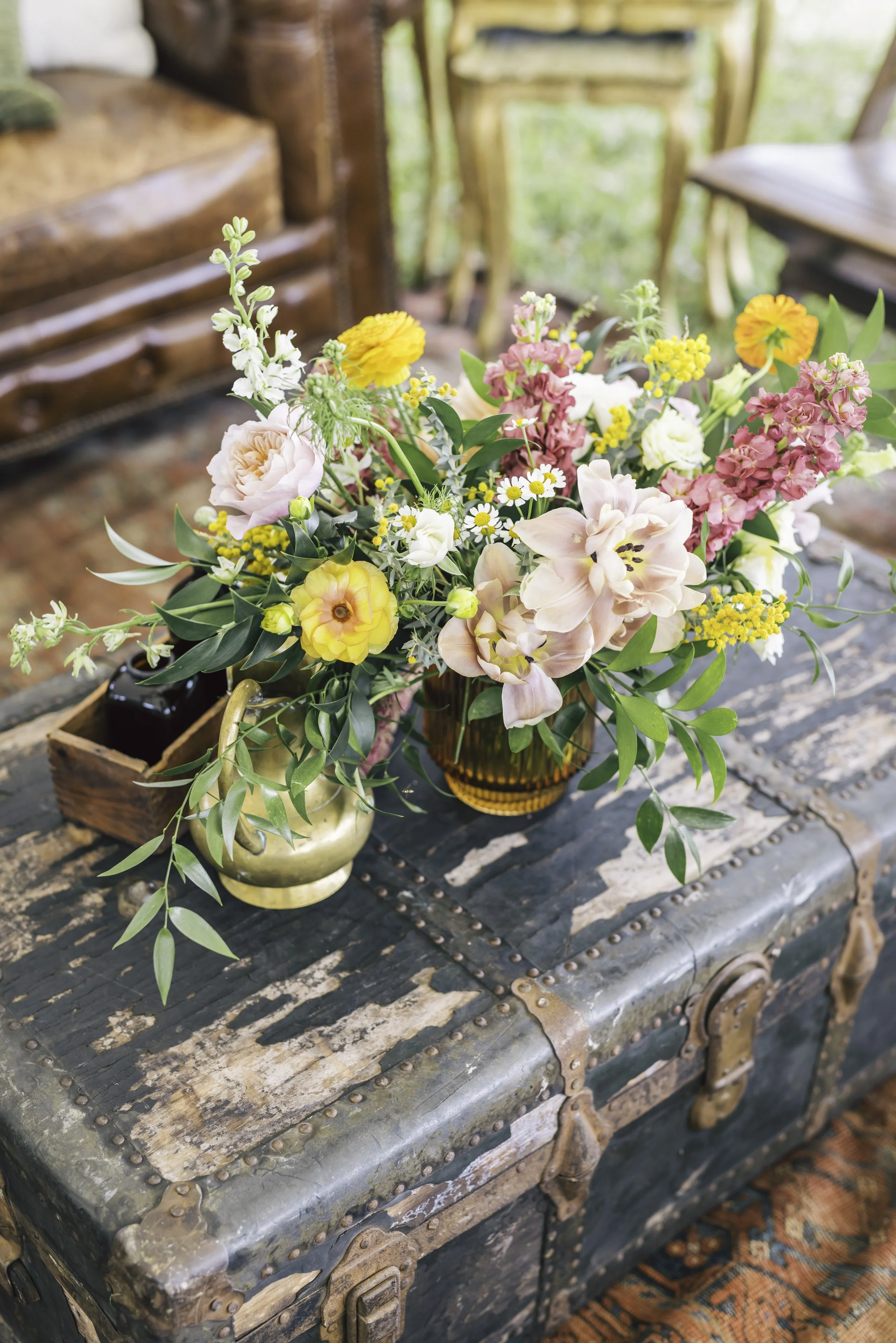 To balance out all of the old vintage furniture and décor, we placed fresh flowers in beautiful bright colors everywhere! These also added the perfect feminine touch to the festivities.