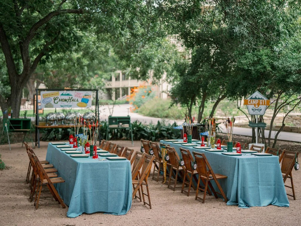 We held the party at an amazing resort tucked away on acres of nature, which was perfect for the camp theme. To greet guests as they arrived, we set up a Camp G11 Welcome sign near the parking area, along with a camping-themed photo backdrop and lots of camping props and decor.