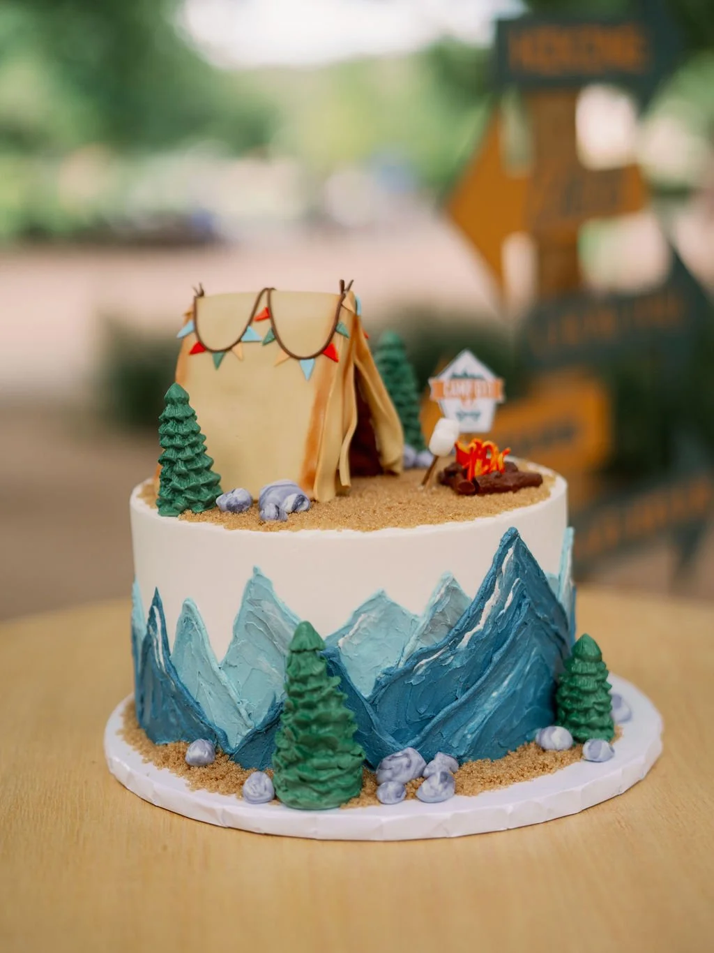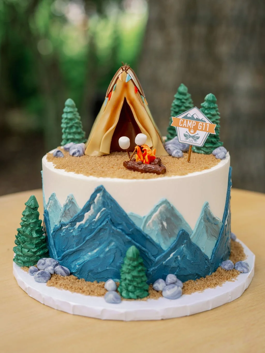 For the birthday boy, we had a gorgeous custom camping-themed cake made. It featured mountain and forest scenery, a pennant flag-embellished camping tent, a campfire with the cutest tiny marshmallows on sticks, and a mini “Camp G11” sign.