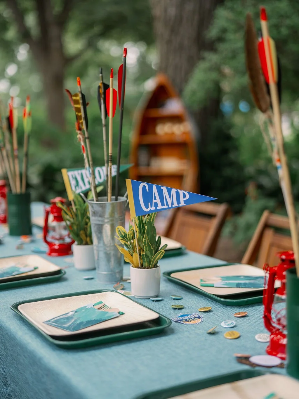 We decorated the tables with camp buttons and patches, plants with pennant flags, lanterns, and containers of archery arrows.