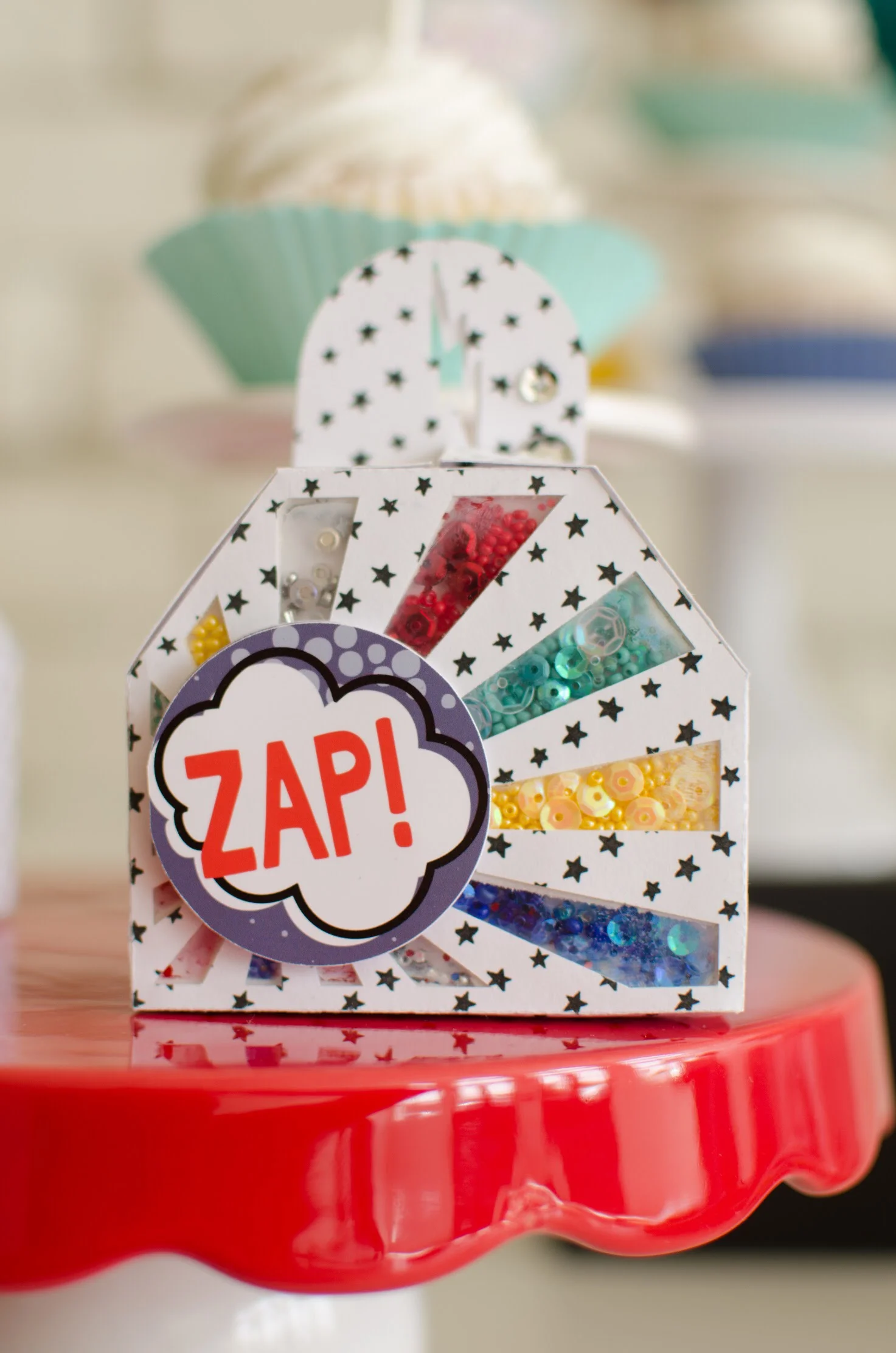 Hosted at One Eleven East, this party was inspired by the retro comic book look and the Super Hero Party Goods from DayDream Society matched perfectly. I hung three super capes on a white brick wall as party’s backdrop. Then I attached the colorful lightning bolts to them.