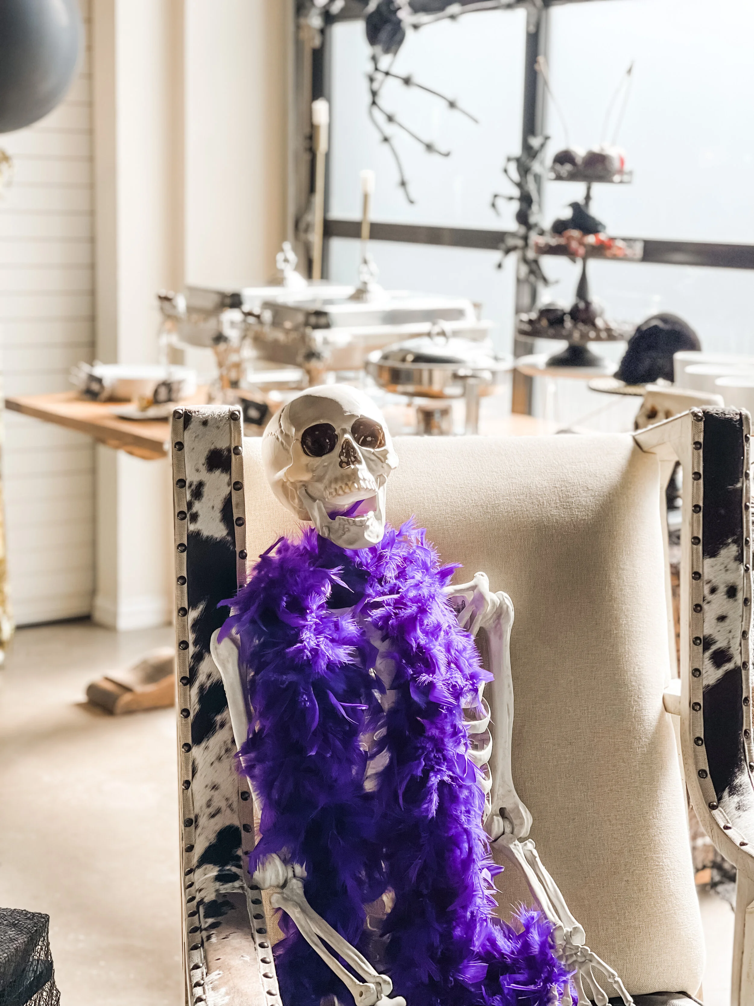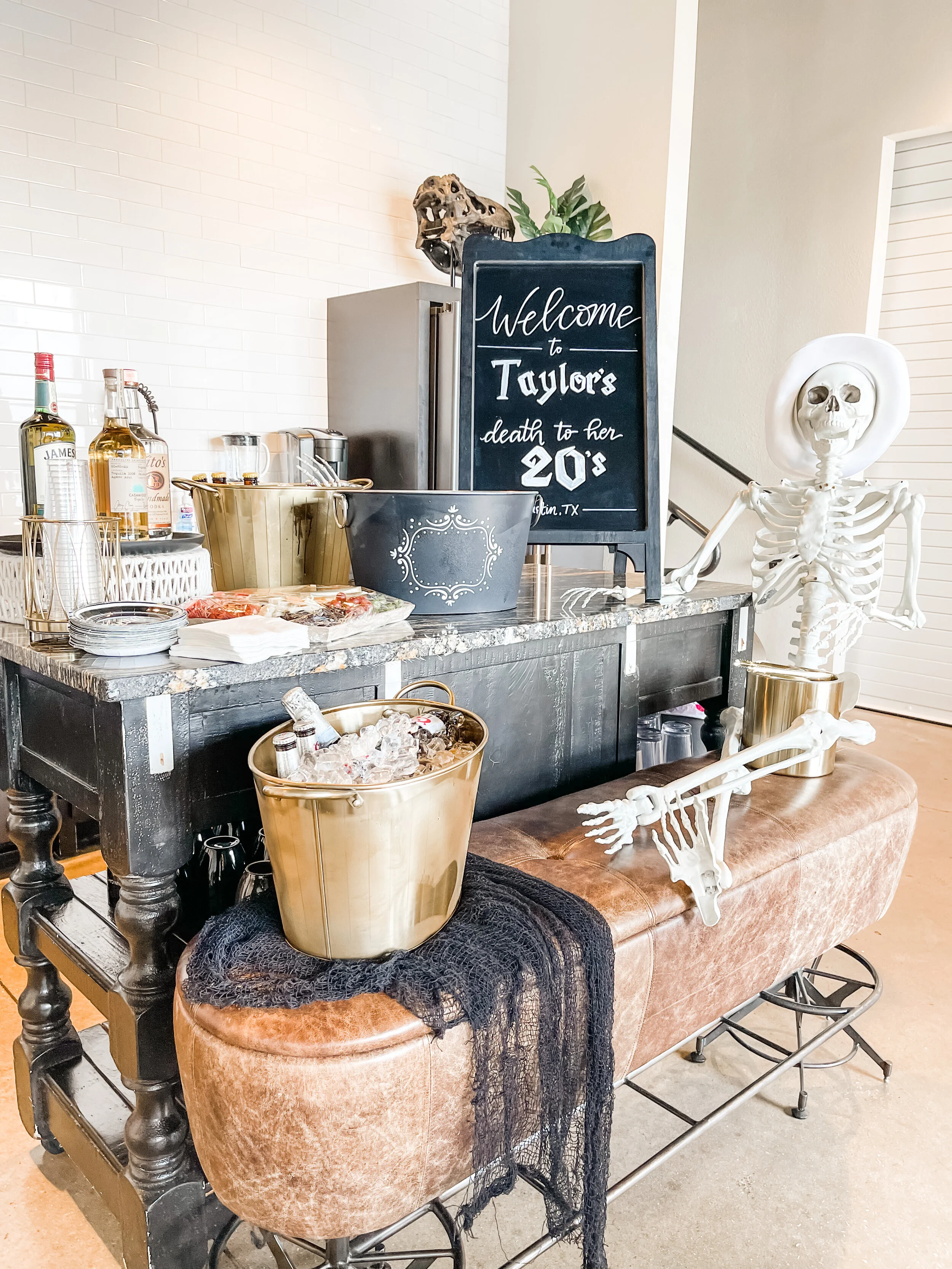 First, we set up a welcome bar for Taylor and her friends to enjoy as soon as they arrived to the hotel. After a day of traveling, they could kick back with a drink and some snacks, and a couple of skeleton friends, too! We filled black and gold ice buckets with a variety of beverages, and set up a charcuterie board. A chalkboard sign welcomed friends to Taylor’s “Death to her 20’s” Party, and a couple of stylish life-sized skeleton props, dressed to party and lounging comfortably, reinforced the theme. We also set up a basket of personalized pool towels (held by spooky skeleton hands), for easy access when Taylor and her friends were ready to lounge by the hotel pool.
