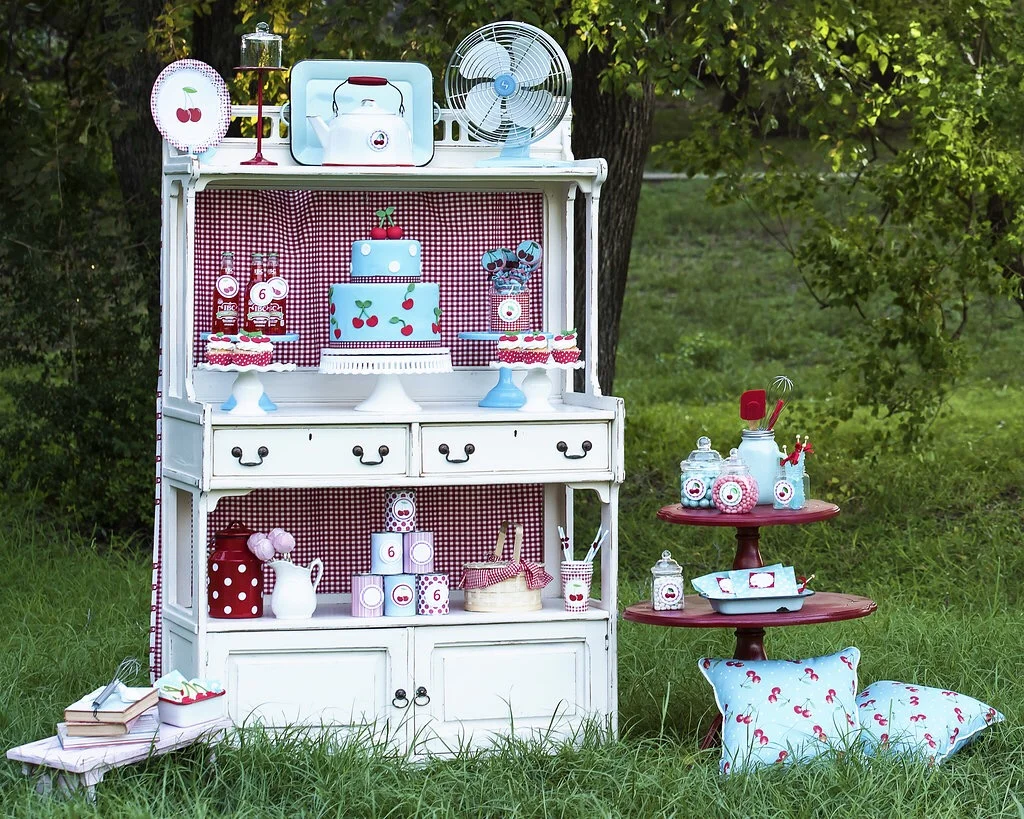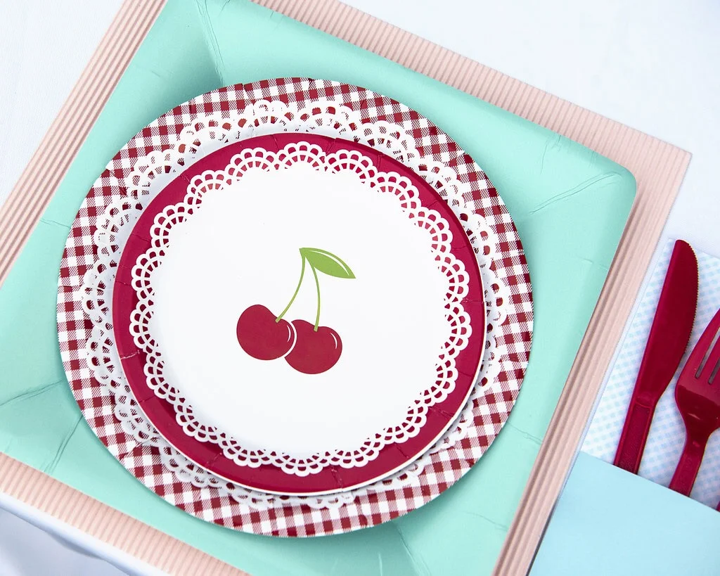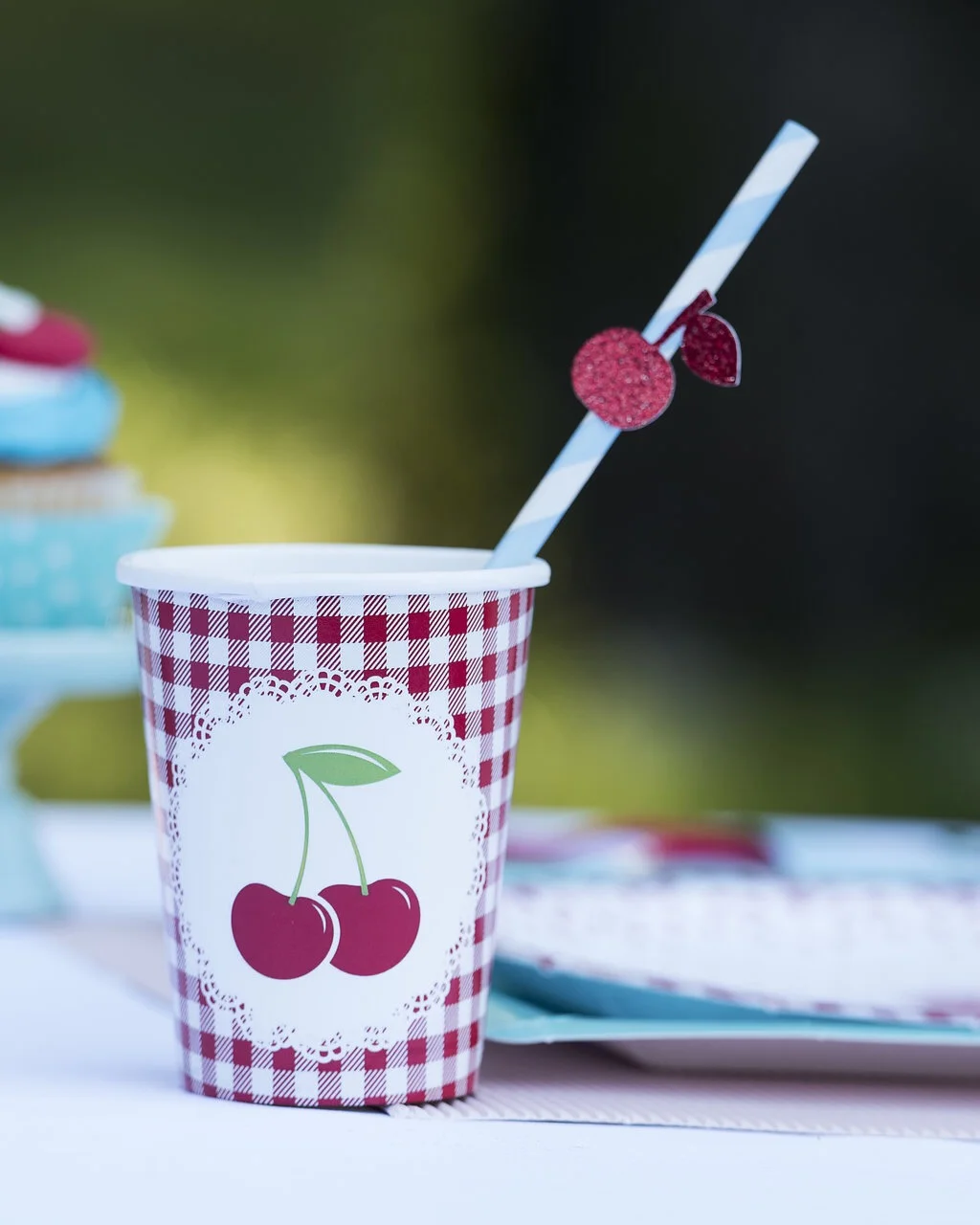My inspiration for this party was the adorable cherry themed party ware collection. Cute sets of coordinating plates and cups with an adorable red gingham print along with a delightful pair of cherries. I dressed the table in white tablecloths, then added my table ware. Each table setting had an individual mini cupcake stand and bright red cutlery.