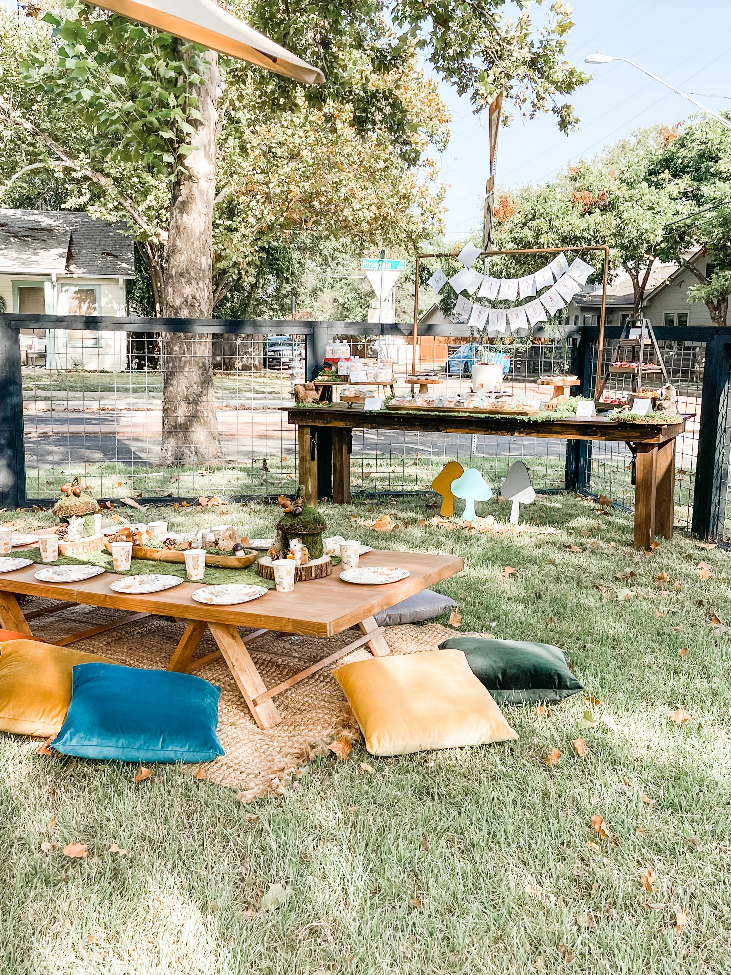 Because this party was for little ones, it was especially important to have seating catered to them. But to be honest, I’m always a fan of low and comfy seating! This is particularly great outdoors, it gives the perfect picnic feel to any party. I set up a low wooden table on top of a natural jute rug, and added lots of comfy pillows to sit on.