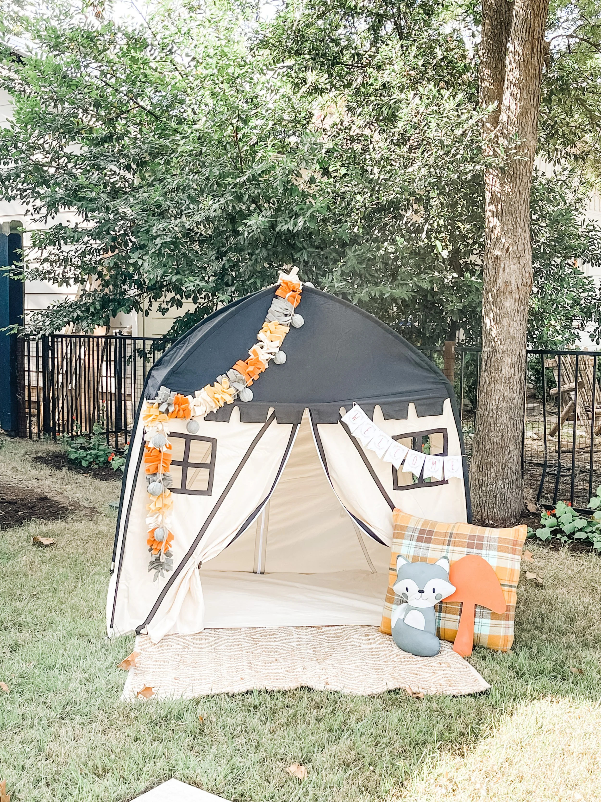 Finally, for a young child’s birthday, you can’t forget entertainment! I love providing a special place for little ones to play that they can feel is their own. In this case, I set up a fun little tent house, decorated with a cozy rug and pillows, and a fluffy felt garland. I stretched a themed “Welcome” sign across one side - this Welcome sign is also included in my free printable set! Sign up below to get it.